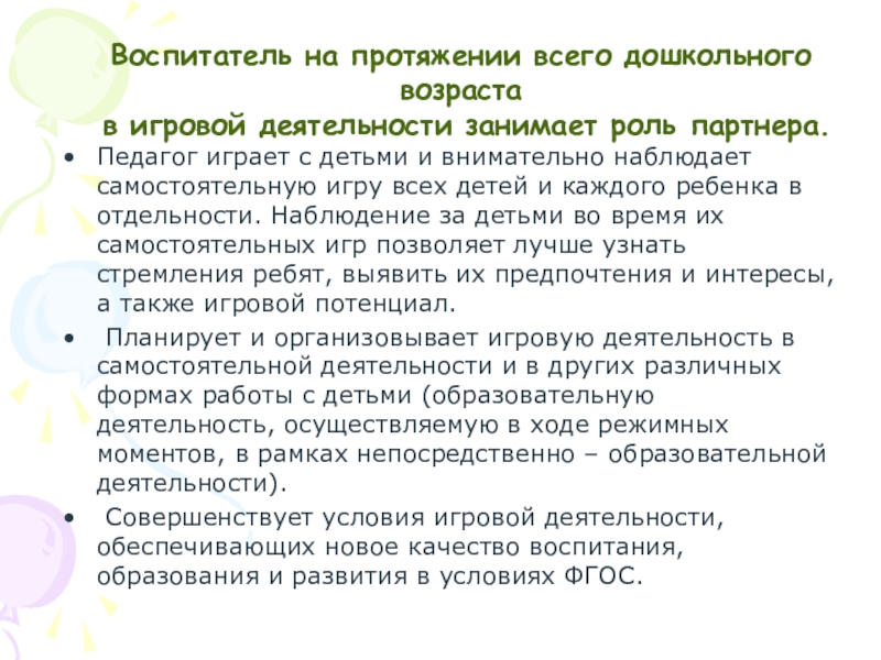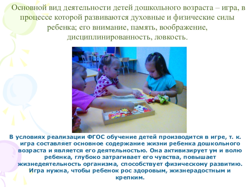 В условиях реализации ФГОС обучение детей производится в игре, т. к. игра составляет основное содержание жизни ребенка дошкольного возраста и является его деятельностью. Она активизирует ум и волю ребенка, глубоко затрагивает его чувства, повышает жизнедеятельность организма, способствует физическому развитию. Игра нужна, чтобы ребенок рос здоровым, жизнерадостным и крепким.