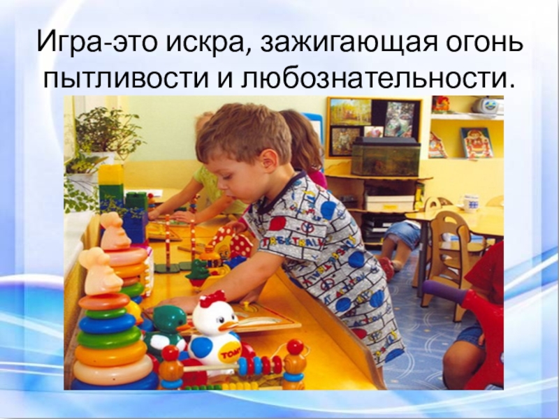 Слайд 2Игра-это искра, зажигающая огонь пытливости и любознательности.