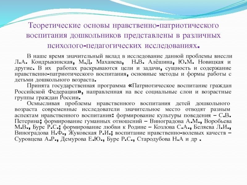время значительный вклад в исследование данной проблемы внесли Л.А. Кондрыкинская, М.Д. Маханева, Н.В. Алёшина, Ю.М. Новицкая и другие. В их работах раскрываются цели и задачи, сущность и содержание нравственно-патриотического воспитания, основные методы и формы работы с детьми дошкольного возраста.