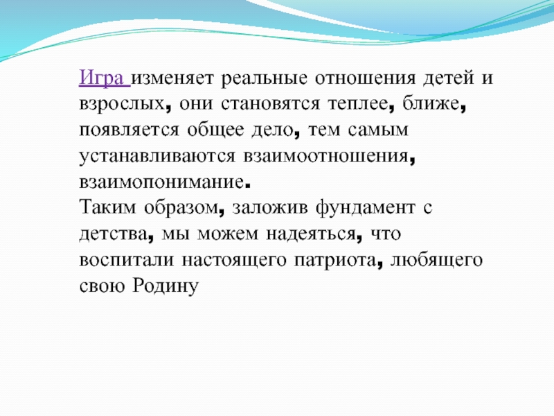 Слайд 25Игра изменяет реальные отношения детей и взрослых, они становятся теплее, ближе,