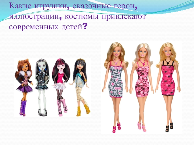 Слайд 11Какие игрушки, сказочные герои, иллюстрации, костюмы привлекают современных детей?