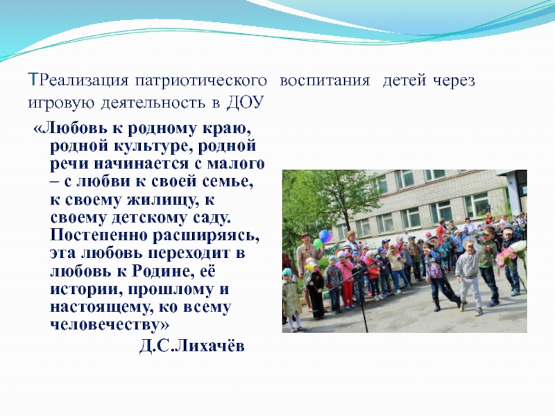 Слайд 3ТРеализация патриотического воспитания детей через игровую деятельность в ДОУ
