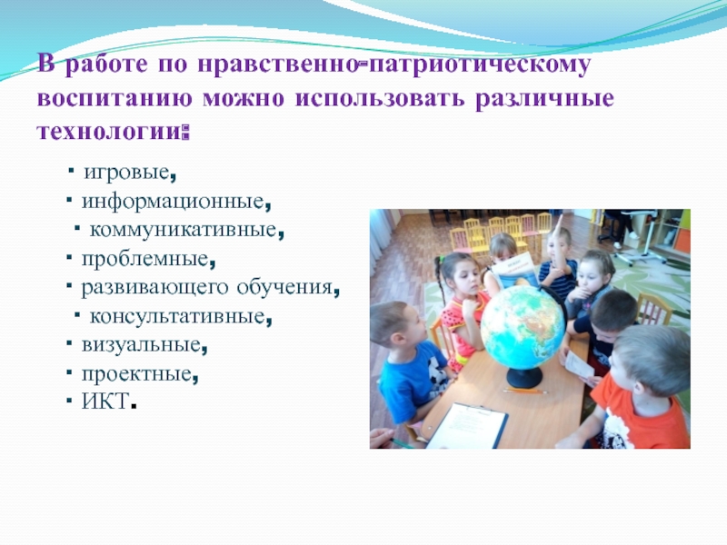 Слайд 6В работе по нравственно-патриотическому воспитанию можно использовать различные технологии: