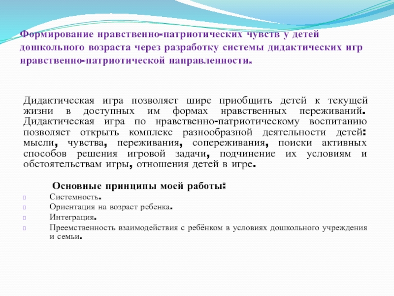 Дидактическая игра позволяет шире приобщить детей к текущей жизни в доступных им формах нравственных переживаний. Дидактическая игра по нравственно-патриотическому воспитанию позволяет открыть комплекс разнообразной деятельности детей: мысли, чувства, переживания, сопереживания, поиски активных способов решения игровой задачи, подчинение их условиям и обстоятельствам игры, отношения детей в игре.