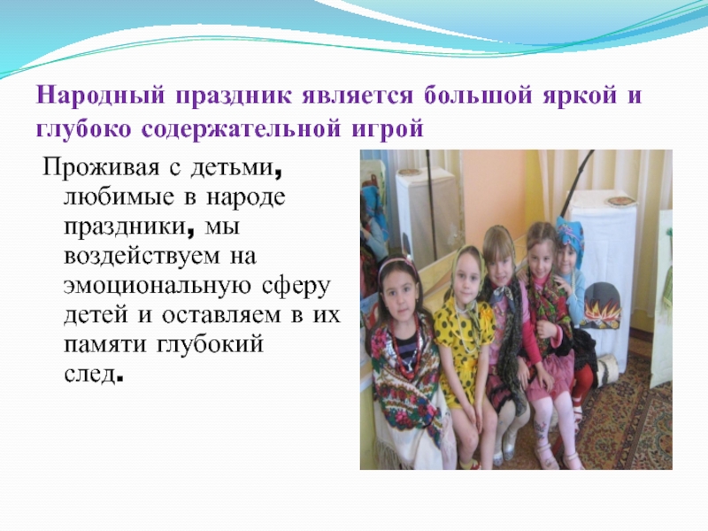 любимые в народе праздники, мы воздействуем на эмоциональную сферу детей и оставляем в их памяти глубокий след.
