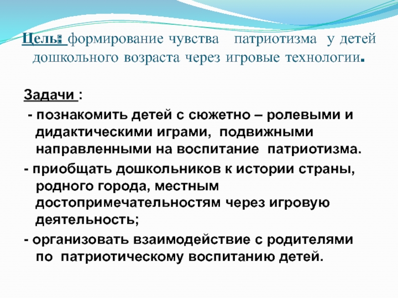Слайд 4Цель: формирование чувства патриотизма у детей дошкольного возраста через игровые