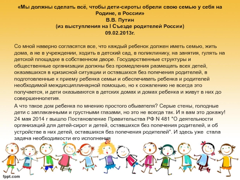 Со мной наверно согласятся все, что каждый ребенок должен иметь семью, жить дома, а не в учреждении, ходить в детский сад, в поликлинику, на занятия, гулять на детской площадке в собственном дворе. Государственные структуры и общественные организации должны без промедления размещать всех детей, оказавшихся в кризисной ситуации и оставшихся без попечения родителей, в подготовленные к приему ребенка семьи и обеспечивать ребенка и родителей необходимой междисциплинарной помощью, но к сожалению не всегда это получается, и дети оказываются в детских домах и домах ребенка и живут в них до совершеннолетия.