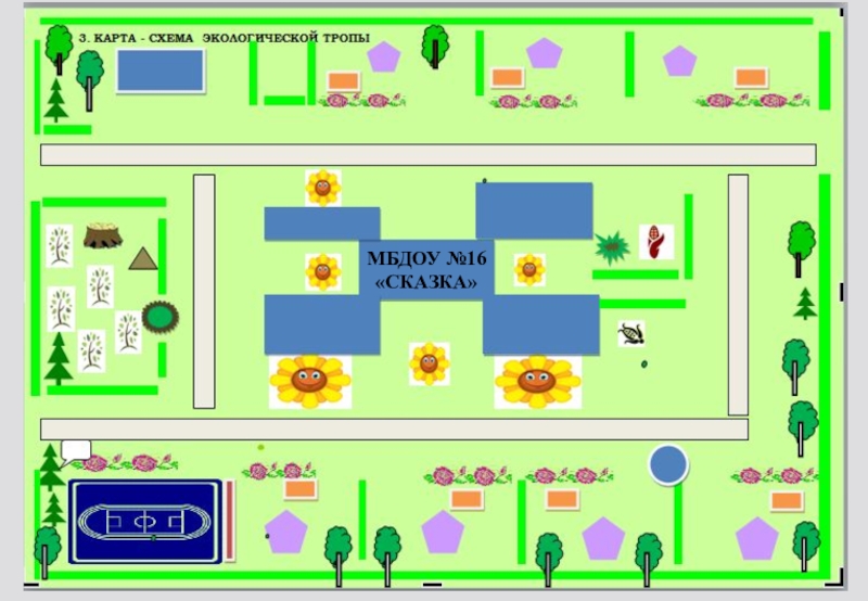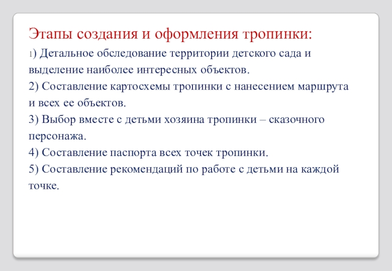 Этапы создания и оформления тропинки:1) Детальное обследование территории детского сада и выделение наиболее интересных объектов.2) Составление картосхемы