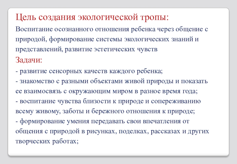 Цель создания экологической тропы: Воспитание осознанного отношения ребенка через общение с природой, формирование системы экологических знаний и представлений, развитие эстетических чувствЗадачи:- развитие сенсорных качеств каждого ребенка;- знакомство с разными объектами живой природы и показать ее взаимосвязь
