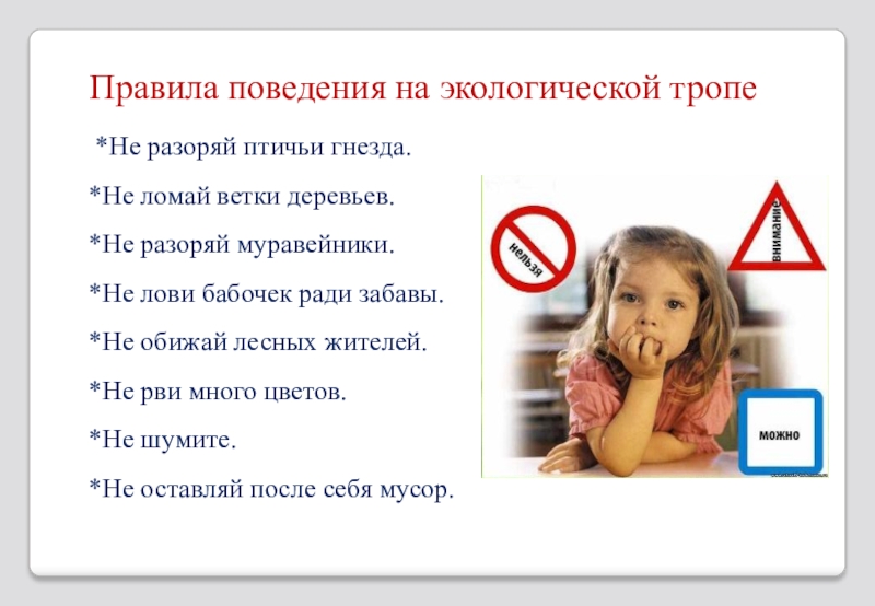 Правила поведения на экологической тропе *Не разоряй птичьи гнезда.*Не ломай ветки деревьев.*Не разоряй муравейники.*Не лови бабочек ради
