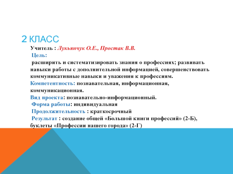 Результат : создание общей «Большой книги профессий» (2-Б),буклеты «Профессии нашего города» (2-Г)