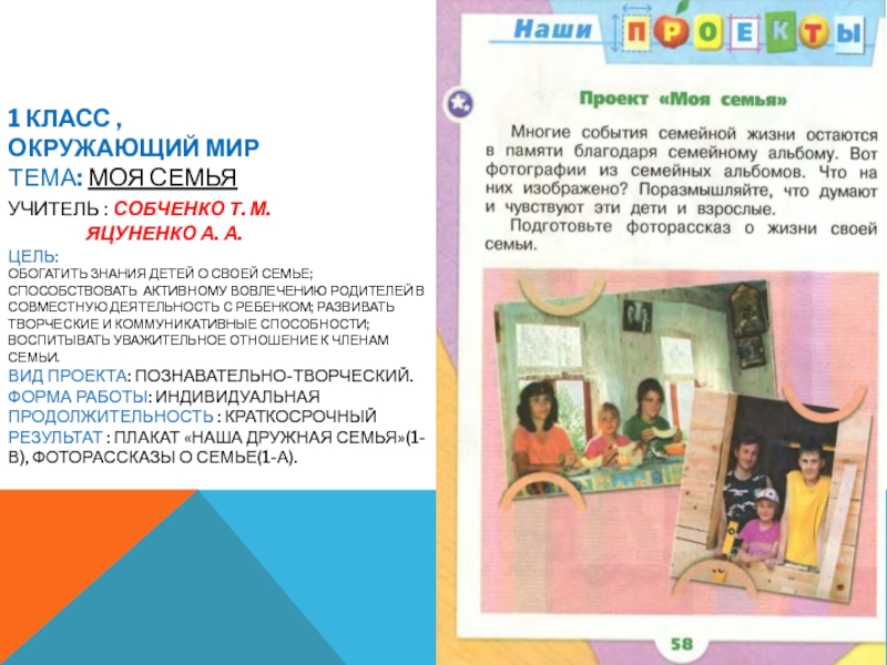 Результат : плакат «Наша дружная семья»(1-В), фоторассказы о семье(1-А).