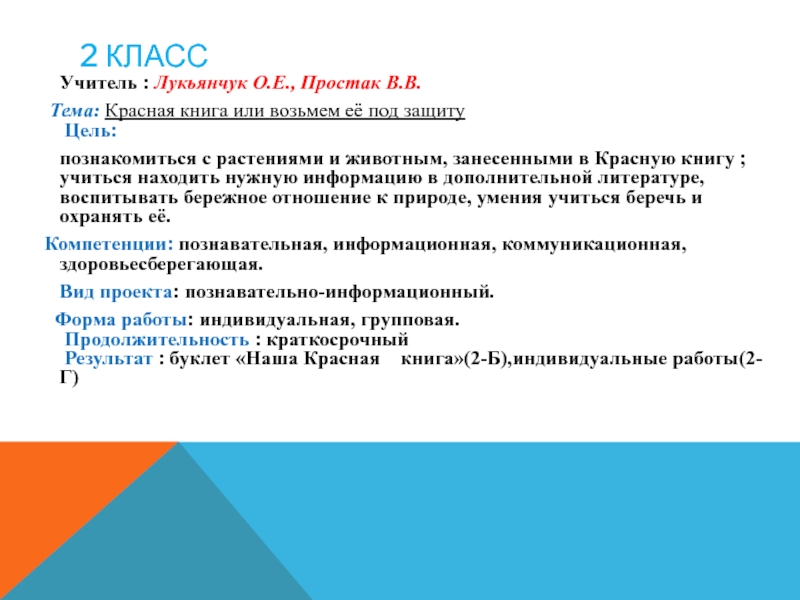 Результат : буклет «Наша Красная книга»(2-Б),индивидуальные работы(2-Г)