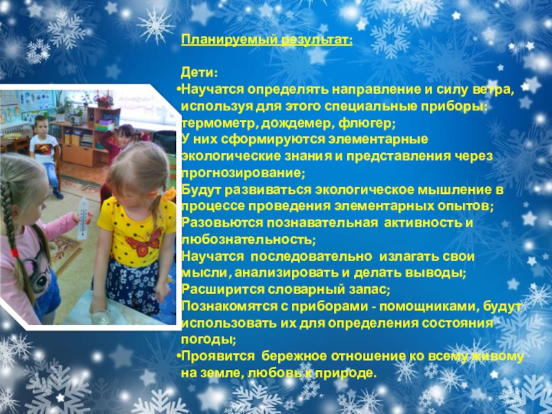 Познакомятся с приборами - помощниками, будут использовать их для определения состояния погоды;