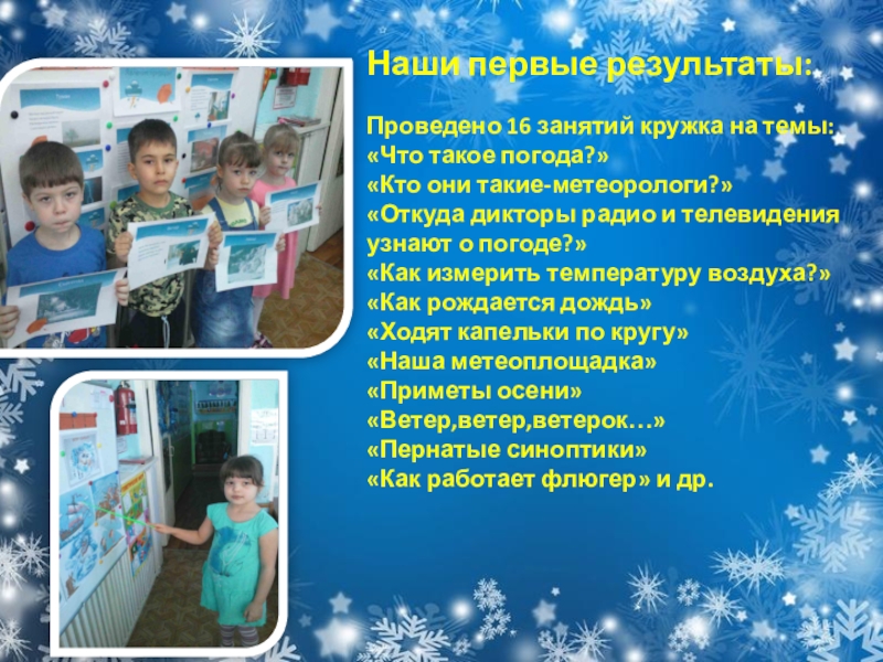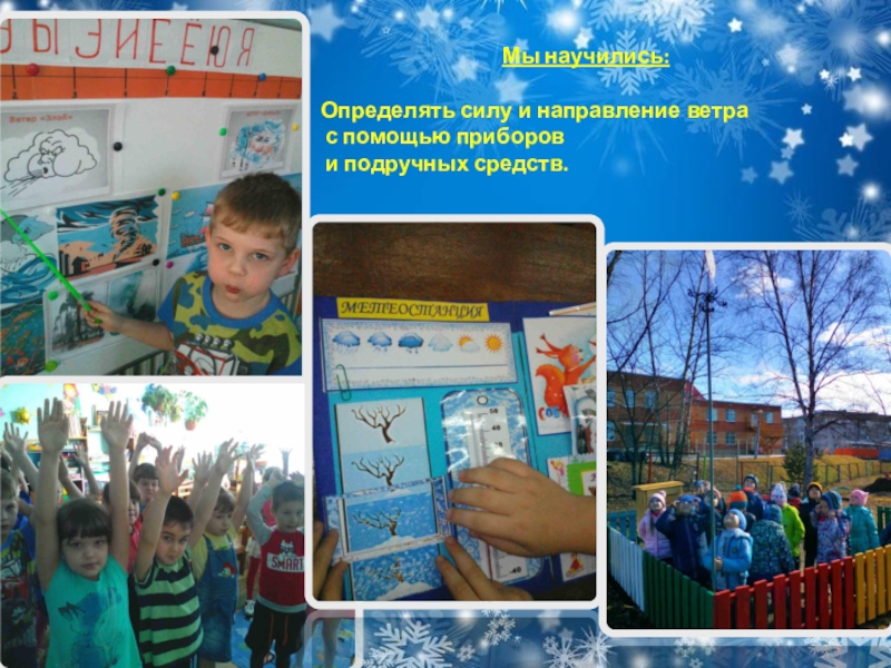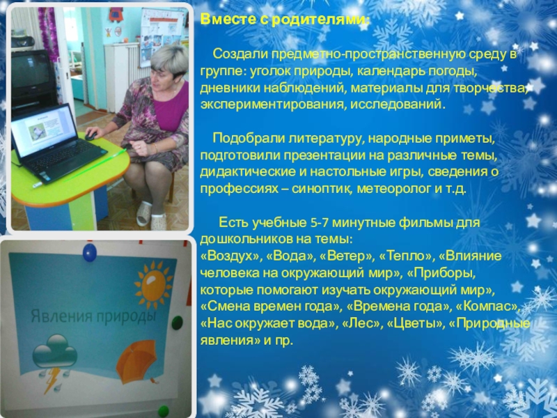 Подобрали литературу, народные приметы, подготовили презентации на различные темы, дидактические и настольные игры, сведения о профессиях – синоптик, метеоролог и т.д.