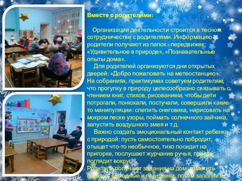 Родители получают задания на дом: отметить погоду в выходные и праздники, потом заполнить дневник в группе и пр.