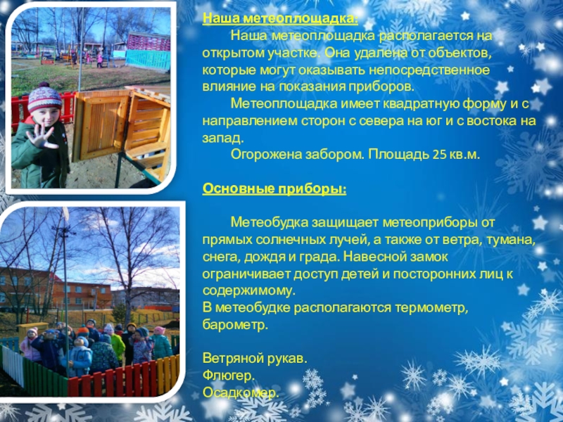 Метеобудка защищает метеоприборы от прямых солнечных лучей, а также от ветра, тумана, снега, дождя и града. Навесной замок ограничивает доступ детей и посторонних лиц к содержимому.