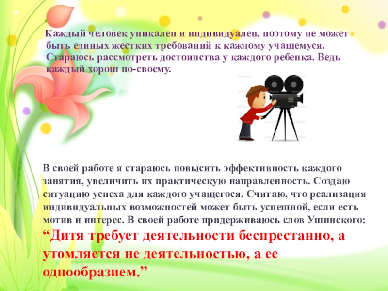 Каждый человек уникален и индивидуален, поэтому не может быть единых жестких требований к каждому учащемуся. Стараюсь рассмотреть достоинства у каждого ребенка. Ведь каждый хорош по-своему.