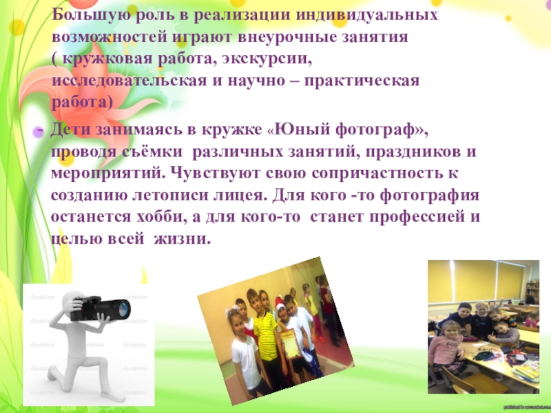 Большую роль в реализации индивидуальных возможностей играют внеурочные занятия