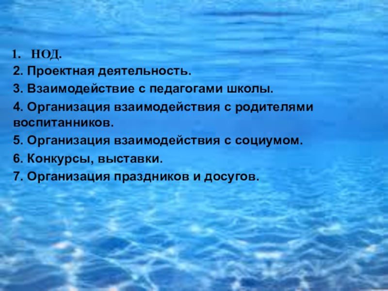 1.  НОД.2. Проектная деятельность.3. Взаимодействие с педагогами школы.4. Организация взаимодействия с родителями воспитанников.5. Организация взаимодействия с