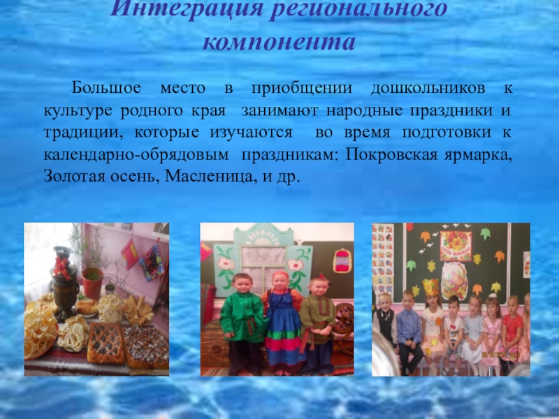 Интеграция регионального компонента  	Большое место в приобщении дошкольников к культуре родного края занимают народные праздники и