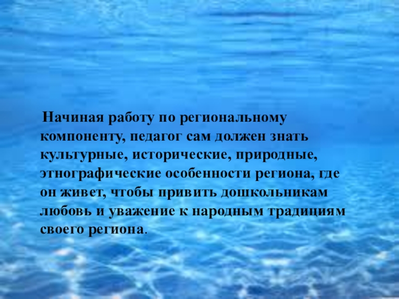 Слайд 4 Начиная работу по региональному компоненту, педагог сам должен знать культурные,