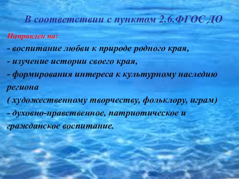 В соответствии с пунктом 2.6.ФГОС ДОНаправлен на:- воспитание любви к природе родного края,- изучение истории своего края,-
