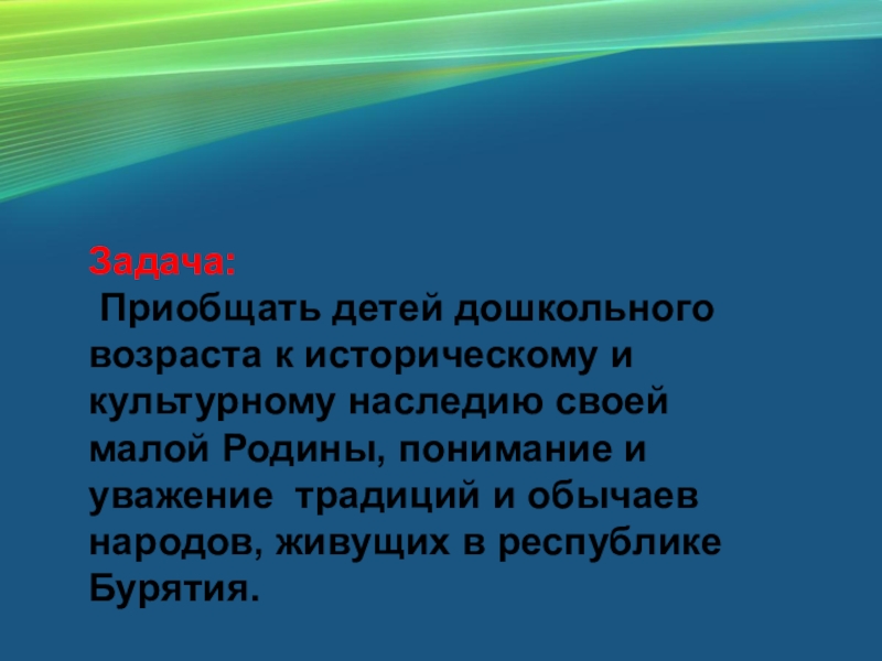 Задача: Приобщать детей дошкольного возраста к историческому и культурному наследию своей малой Родины, понимание и уважение традиций и обычаев народов, живущих в республике Бурятия.