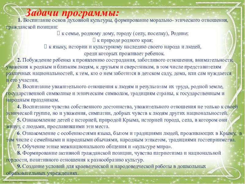 4. Воспитание чувства собственного достоинства, уважительного отношения не только к своей этнической группе, но и уважения, симпатии, добрых чувств к людям других национальностей.