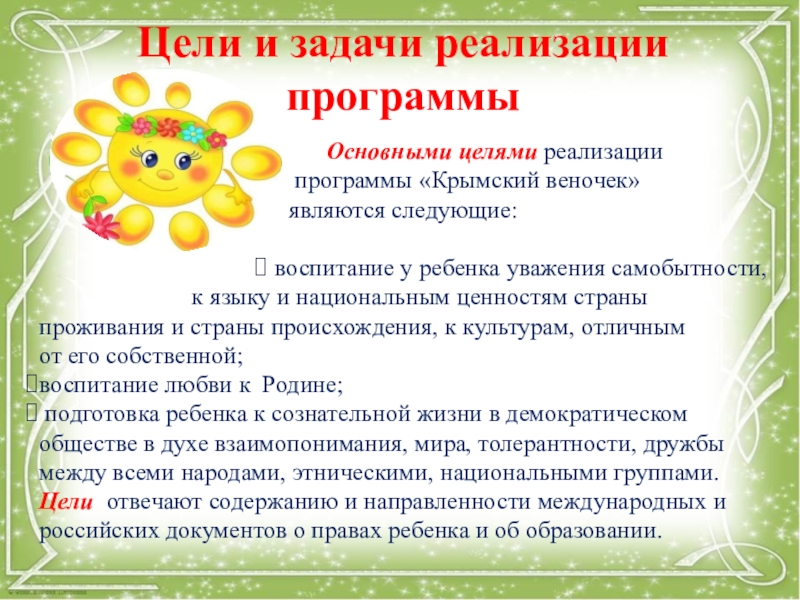 Цели отвечают содержанию и направленности международных и российских документов о правах ребенка и об образовании.