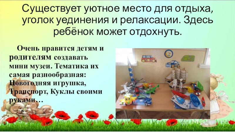 Слайд 16Существует уютное место для отдыха, уголок уединения и релаксации. Здесь ребёнок