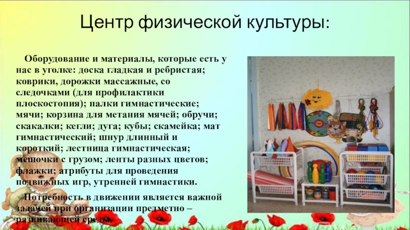 Потребность в движении является важной задачей при организации предметно – развивающей среды.