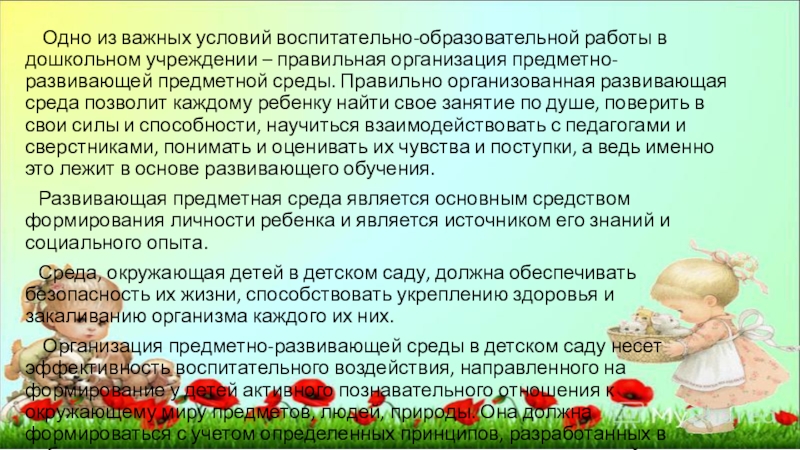 Организация предметно-развивающей среды в детском саду несет эффективность воспитательного воздействия, направленного на формирование у детей активного познавательного отношения к окружающему миру предметов, людей, природы. Она должна формироваться с учетом определенных принципов, разработанных в работах ведущих педагогов, в частности – с учетом возраста детей, поскольку каждая возрастная группа обладает своими специфическими психолого-педагогическими характеристиками.