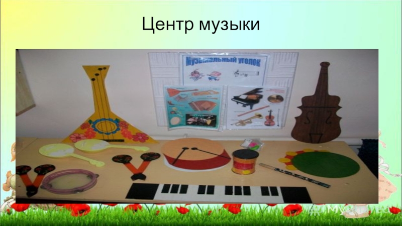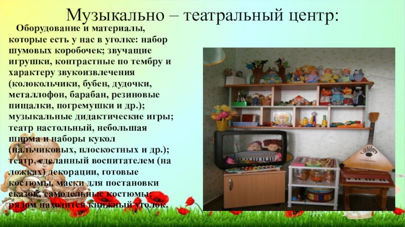 нас в уголке: набор шумовых коробочек; звучащие игрушки, контрастные по тембру и характеру звукоизвлечения (колокольчики, бубен, дудочки, металлофон, барабан, резиновые пищалки, погремушки и др.); музыкальные дидактические игры; театр настольный, небольшая ширма и наборы кукол (пальчиковых, плоскостных и др.); театр, сделанный воспитателем (на ложках) декорации, готовые костюмы, маски для постановки сказок, самодельные костюмы; рядом находится книжный уголок.