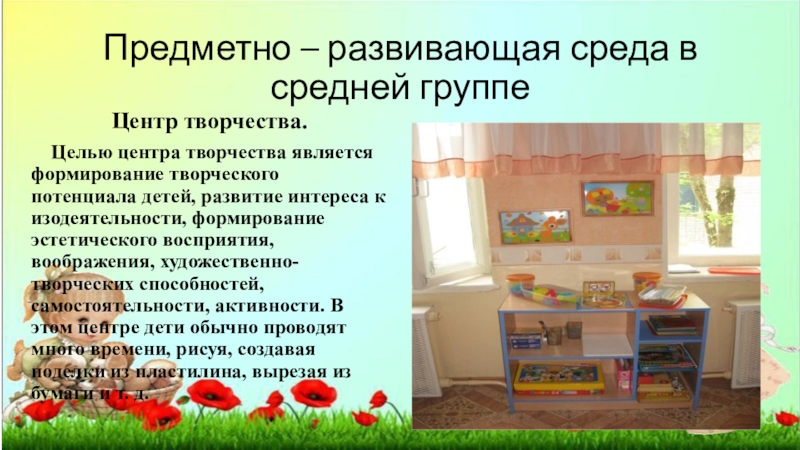 творчества является формирование творческого потенциала детей, развитие интереса к изодеятельности, формирование эстетического восприятия, воображения, художественно-творческих способностей, самостоятельности, активности. В этом центре дети обычно проводят много времени, рисуя, создавая поделки из пластилина, вырезая из бумаги и т. д.