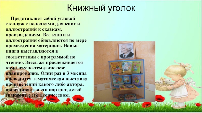 и иллюстраций к сказкам, произведениям. Все книги и иллюстрации обновляются по мере прохождения материала. Новые книги выставляются в соответствии с программой по чтению. Здесь же прослеживается комплексно-тематическое планирование. Один раз в 3 месяца проводится тематическая выставка произведений какого либо автора, вывешивается его портрет, детей знакомят с его творчеством.