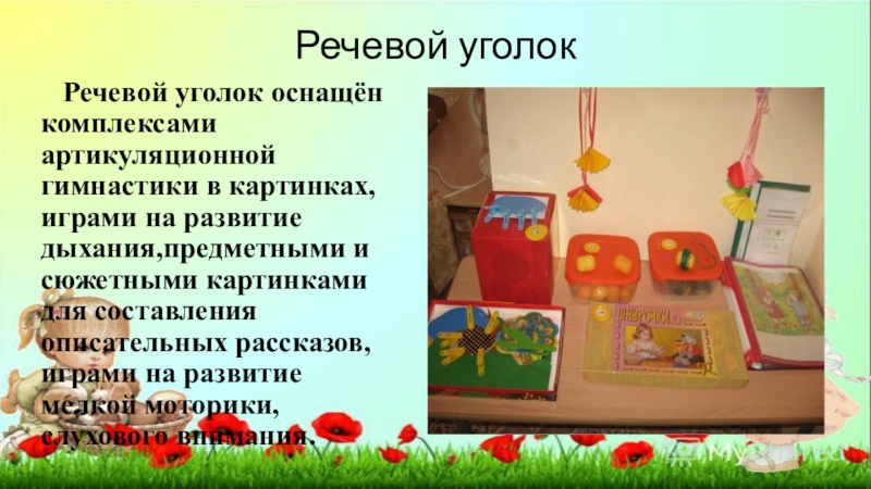 Речевой уголок оснащён комплексами артикуляционной гимнастики в картинках,