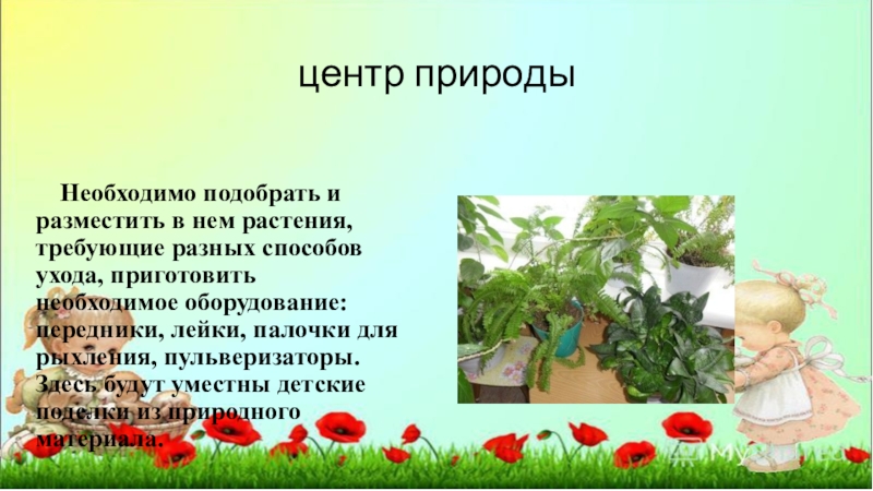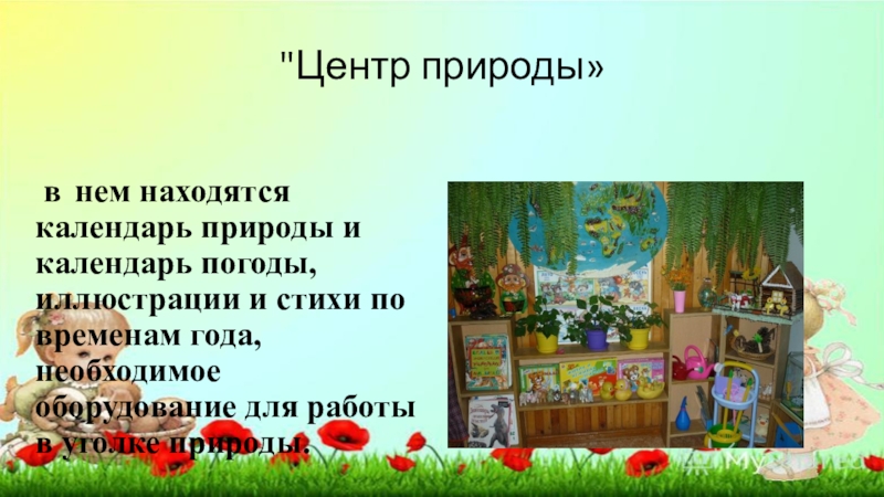 иллюстрации и стихи по временам года, необходимое оборудование для работы в уголке природы.