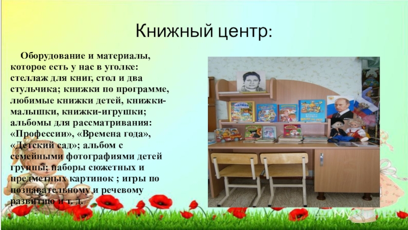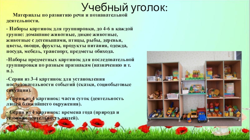 уголке: стеллаж для книг, стол и два стульчика; книжки по программе, любимые книжки детей, книжки-малышки, книжки-игрушки; альбомы для рассматривания: «Профессии», «Времена года», «Детский сад»; альбом с семейными фотографиями детей группы; наборы сюжетных и предметных картинок ; игры по познавательному и речевому развитию и т. д.