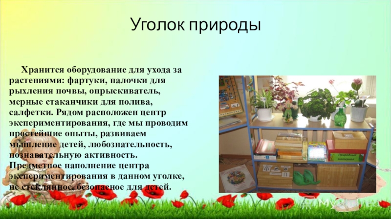 палочки для рыхления почвы, опрыскиватель, мерные стаканчики для полива, салфетки. Рядом расположен центр экспериментирования, где мы проводим простейшие опыты, развиваем мышление детей, любознательность, познавательную активность. Предметное наполнение центра экспериментирования в данном уголке, не стеклянное, безопасное для детей.
