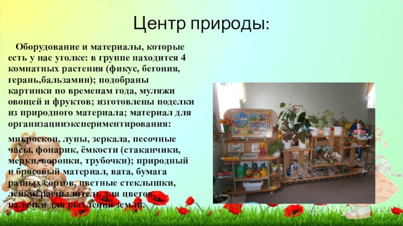 в группе находится 4 комнатных растения (фикус, бегония, герань,бальзамин); подобраны картинки по временам года, муляжи овощей и фруктов; изготовлены поделки из природного материала; материал для организацииэкспериментирования: