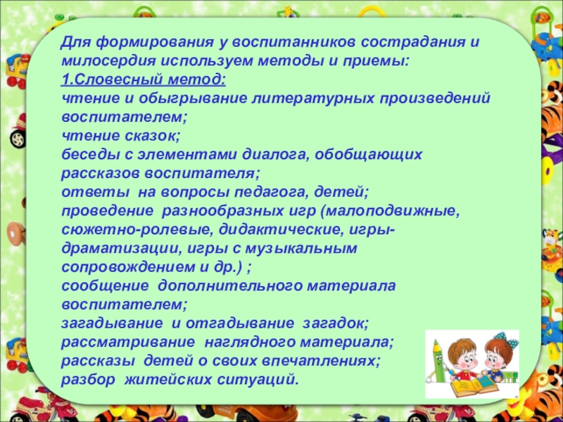 Слайд 15Для формирования у воспитанников сострадания и милосердия используем методы и приемы: