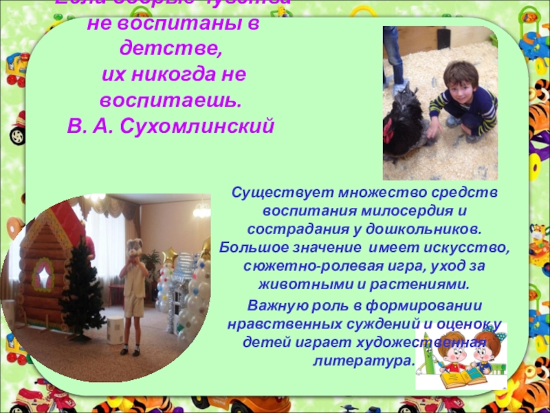 Существует множество средств воспитания милосердия и сострадания у дошкольников. Большое значение имеет искусство, сюжетно-ролевая игра, уход за животными и растениями.
