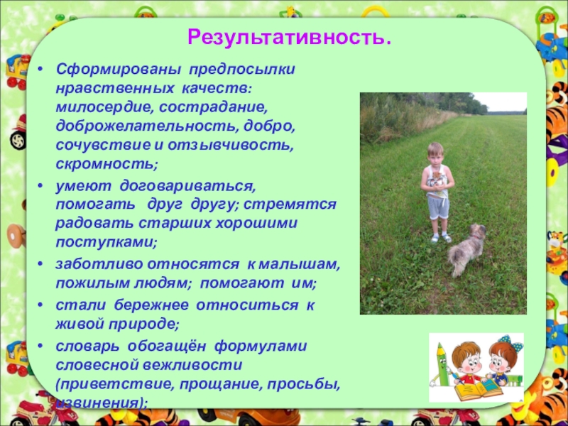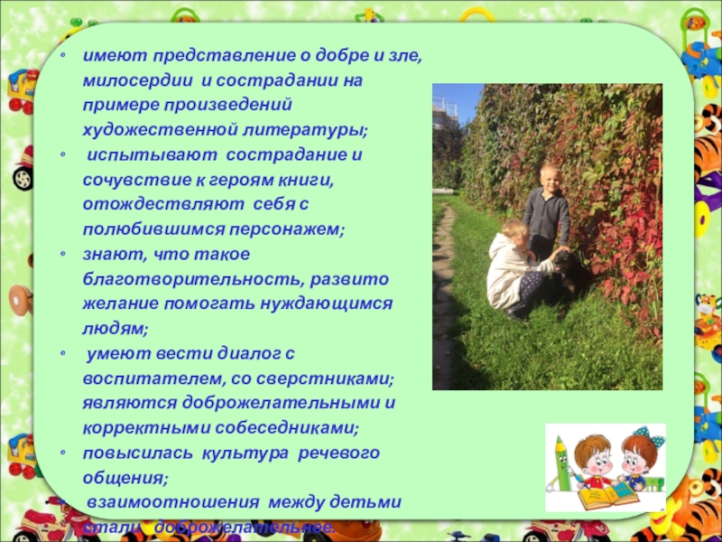 Сформированы предпосылки нравственных качеств: милосердие, сострадание, доброжелательность, добро, сочувствие и отзывчивость,