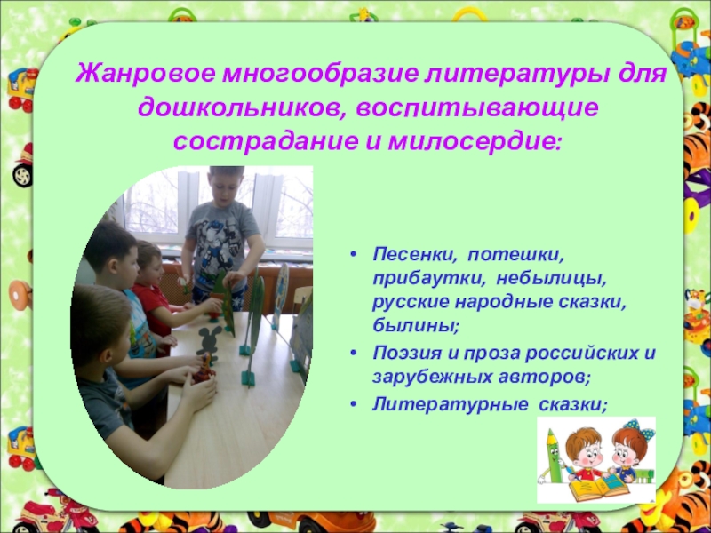 Слайд 6 Жанровое многообразие литературы для дошкольников, воспитывающие сострадание и милосердие: