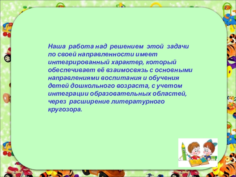 характер, который обеспечивает её взаимосвязь с основными направлениями воспитания и обучения детей дошкольного возраста, с учетом интеграции образовательных областей, через расширение литературного кругозора.
