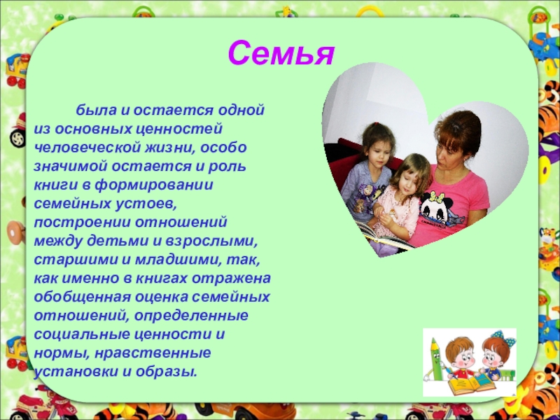 основных ценностей человеческой жизни, особо значимой остается и роль книги в формировании семейных устоев, построении отношений между детьми и взрослыми, старшими и младшими, так, как именно в книгах отражена обобщенная оценка семейных отношений, определенные социальные ценности и нормы, нравственные установки и образы.