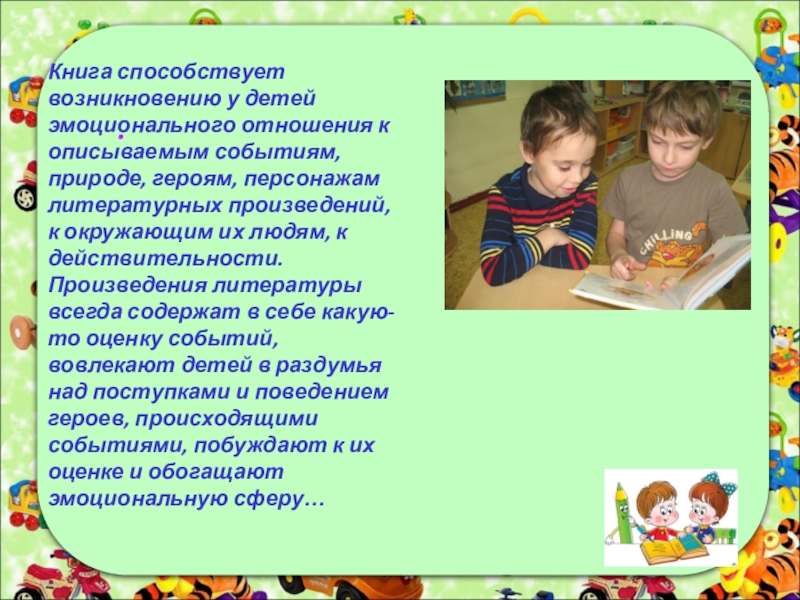 героям, персонажам литературных произведений, к окружающим их людям, к действительности. Произведения литературы всегда содержат в себе какую-то оценку событий, вовлекают детей в раздумья над поступками и поведением героев, происходящими событиями, побуждают к их оценке и обогащают эмоциональную сферу…
