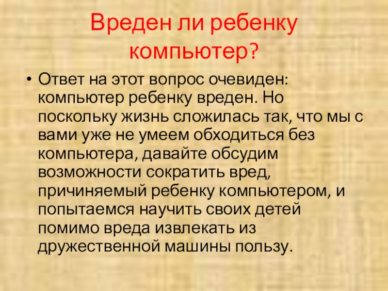 Слайд 3Вреден ли ребенку компьютер?