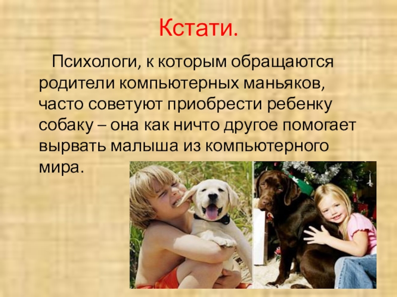 часто советуют приобрести ребенку собаку – она как ничто другое помогает вырвать малыша из компьютерного мира.